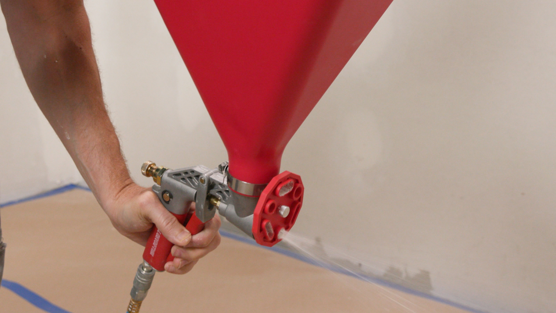 • Sprays acoustics, drywall mud, silica sand with primer, waterproofing, concrete overlays, and most other gravity fed materials